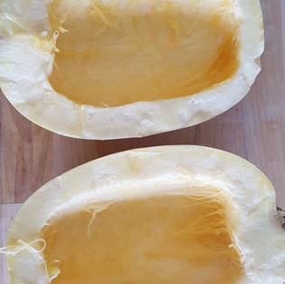 2. Cut Spaghetti squash in half, length ways, and scoop out seeds, a soup spoon makes this job a lot easier. GOOD TIP save the seeds and dry them for planting next season.